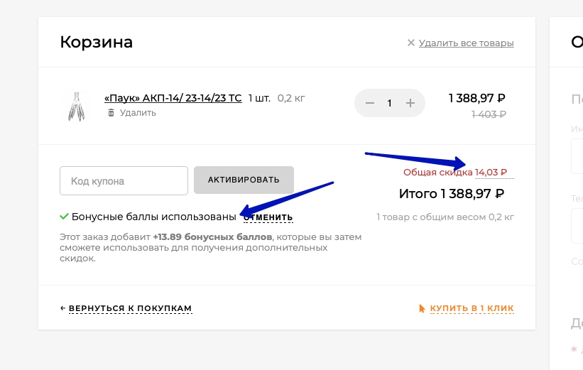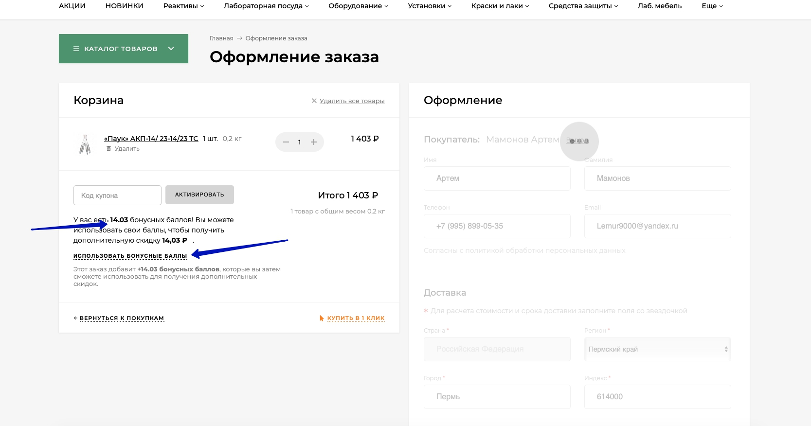 Использовать бонусы можно в корзине (бонусы отображаются при авторизации на сайте).